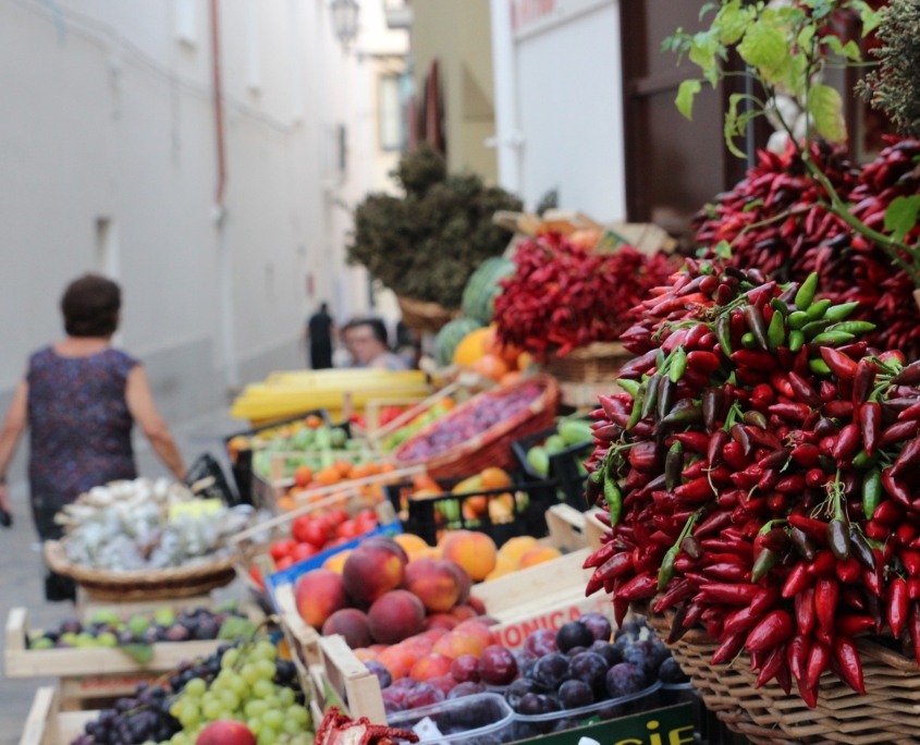 La magia continua a compiersi e tutto si rallenta, nelle forme nei colori. Donne con gonne corte al ginocchio, giunoniche e dal seno pieno e prosperoso, attraversano la piazza cariche di spesa e bustoni dal fruttarolo, vien voglia di buttarsi per terra e di giocar con loro sotto trentatrè gradi di sole poco benevolo. Pomodori rossi rotolano sul selciato, cade la pianta di basilico, le cipolle sono imprendibili: nella raccolta il sacrificio del pomodoro anticipa il bollore del sugo sul fuoco, i bambini corrono intorno, giochi giulivi. Corro in soccorso della signora anziana e vestita di nero, mi ringrazia con il suo sorriso dinoccolato.